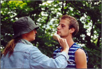 Drehtagebuch I - Elbchaussee 14.-16.06.03 Hier entfernt unsere Schminktischschwenkerin Clarissa Goss gerade mit einer groben Fusselbürste aus echten Elefantenborsten die Speisereste aus Sebastian Scheuthles Bartansatz.