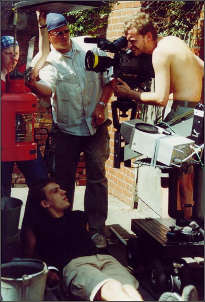 Drehtagebuch II - Bootshaus Barmeier 17.06.03 Hobbyfußmatte Poki sieht auf dem Monitor, dass Klappengirl Ole mit dieser schwarzen Tafel das ganze Bild verdeckt. Alien fächelt derweil dem Aktmodell Tim etwas Seeluft in die Frisur.