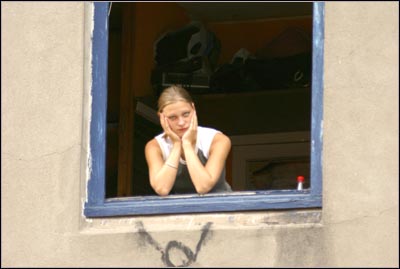 Drehtagebuch IV - Hafenklang 24.06.03 Da kann man schonmal verdutzt aus dem Fenster gucken, ohne gleich befürchten zu müssen, in entstellender Weise für irgendsoeine Website abgelichtet zu werden.