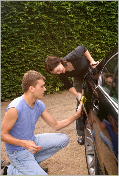Poki ist noch am trockenwischen da fängt Pu an, das Auto für die Wüstenralley-Szene zu präparieren.
